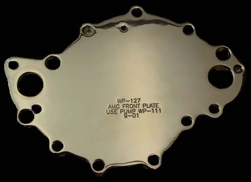 Both the 100 and the 300 Series Meziere Electric Water Pumps use the same Meziere WP127 Backing plate which attaches to the timing cover on the front of the AMC V-8 engine in place of the stock water pump.