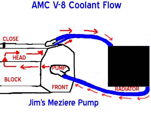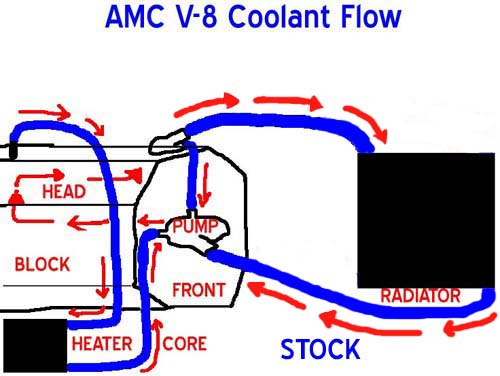 a stock AMC-V-8 Engine circulates coolant. Stock- The bypass hose allows the stock water pump to move coolant with less